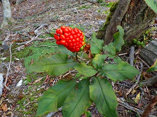 テープのところまで戻り、素直に誘導に従って歩くうち鉄塔に出ました。関電の巡視路に合流。マムシグサの赤い実と、サワフタギの青いきれいな実が成っていました。