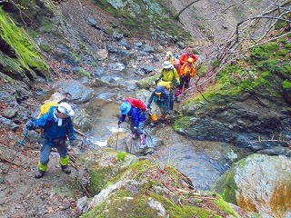 川が二俣になってるところを右側に渡渉しました。今日一回目の渡渉です。会長が歩きやすいところを見極めて誘導してくださいました。なんとかがんばって渡ります。私は必死でしたが、みなさんはどうだったのでしょう。背丈のあるS古さんは余裕そうでした。