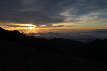 昨日よりも天気は良さそうです。5時前に歩き出すとご来光が見えだした。空気が冷たく爽やかで気持ちがいい。昨日下って来た道を常念岳に向けてゴロゴロした岩の登山道をジグザグに登り返します。目の前に現れる槍ヶ岳、大キレット、奥穂高岳の稜線が素晴らしい。