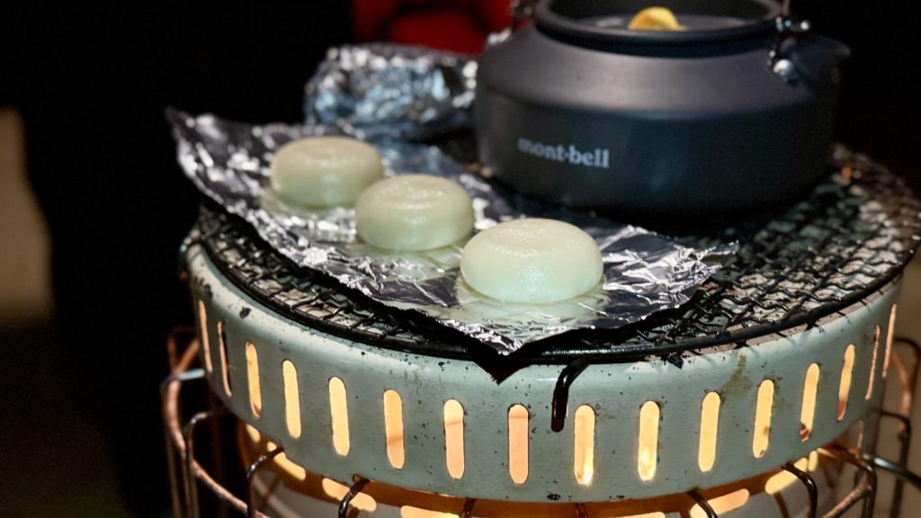 各自が工夫を凝らしたメニューを持参し、ストーブでお餅を焼くメンバーもいた。