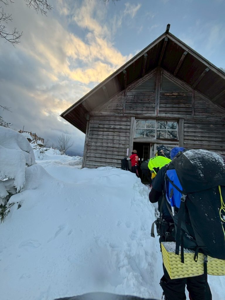 無雪期なら2~3時間で登れるコースだが、今回は6時間もの時間をかけ、日没ギリギリにようやく山頂の避難小屋へ到着した。