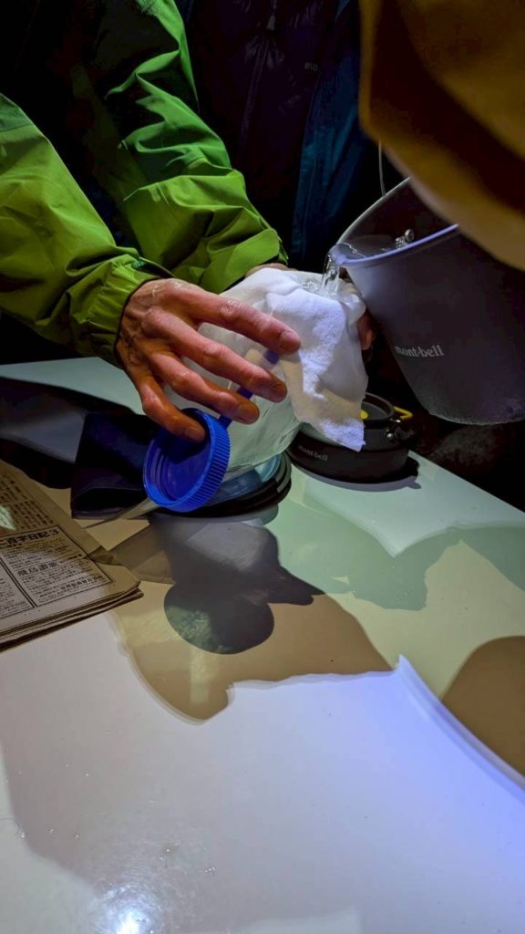 雪山では広口のプラティパスにガーゼなどを当てて、水を濾す