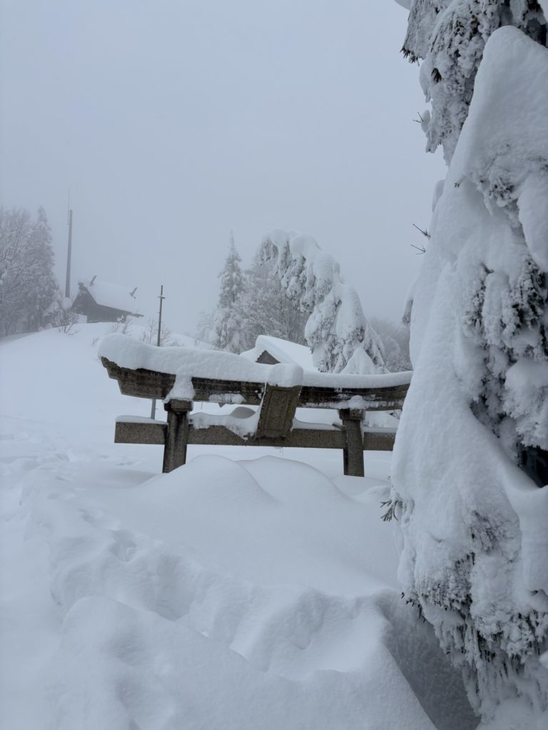 天候はみぞれ混じりの雪。日野山山頂にある大きな鳥居がどれくらい雪に埋まっているか、それを確認するのが今回の楽しみの一つである。
