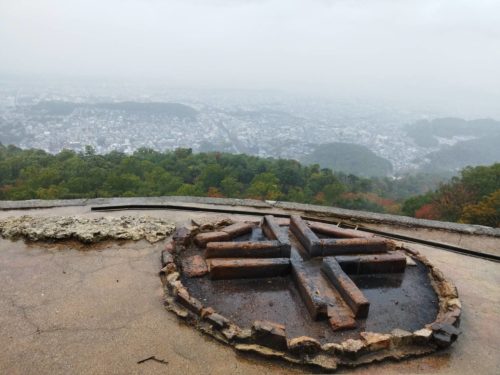 展望は濃霧に包まれて真っ白で街は見えない。まるで雲の上にいるような気分。雨が再び降り出した為、大津京迄歩くのをやめて火床へ移動して屋根のある建物の中で休憩した。