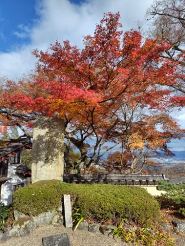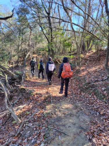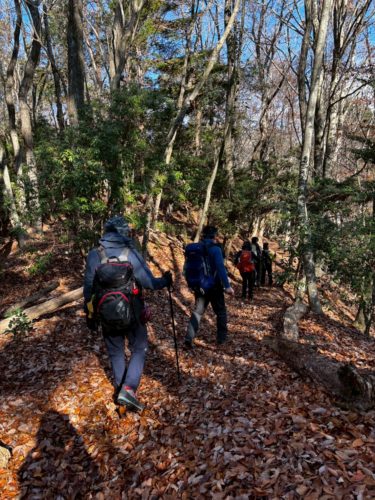山頂に設けられたテーブルで昼食後、下山のため出発、往路で通過した杉谷集落への分岐を左にとり、しばらく尾根筋を歩いて谷に向かうと擬木階段の鉄製支柱が落葉に埋もれ見えづらい箇所もあったが、手摺も設置され、歩行しやすいコースであった。その後、集落を横切り、ジグザグ道を下り、出発地点の善峯寺に帰着。