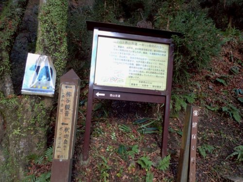 善峯寺駐車場前の道路脇に設置された「釈迦岳経由ポンポン山」の標識から山道に入り、左手に善峯寺の境内を見ながら山道を登ったが、山道は落葉でいっぱいで滑らないように注意を払い、釈迦岳へ向かった。