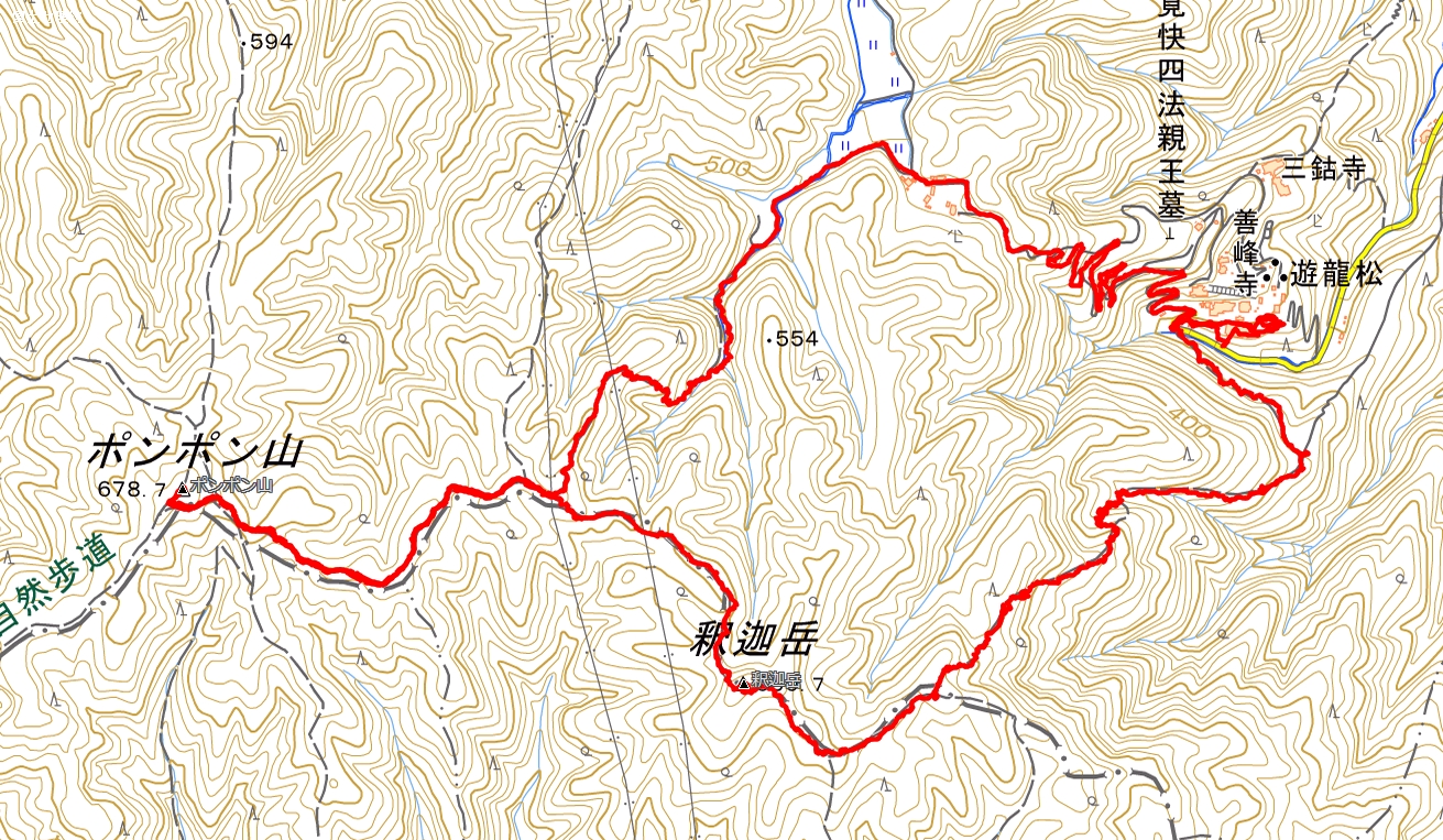 | コ ー ス | 善峯寺(9:11)→釈迦岳(10:25~10:35)→杉谷分岐(10:49)→ポンポン山(11:05~11:48)→杉谷分岐 (12:00)→杉谷(12:23)→善峯寺(12:46) |