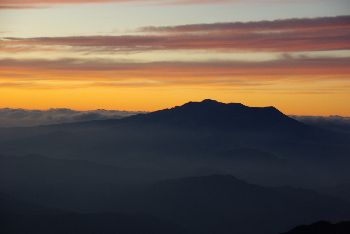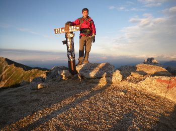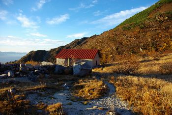 早々に昼食を済ませ出発。越百山に着く前から青空になり、山頂では大パノラマが待っていた。行く手に仙涯嶺が斜光を浴びて巨大なシルエットとなり、驚くべき高度感と急傾斜で見るものを圧迫する。さらにその奥には南駒ヶ岳が俊立しており、まだあそこまでいかなければならないのか思うと気が遠くなりそうであった。すでに疲れがきているので、事故を起こさぬよう注意をしていかなければならない。ガレ場のアップダウンを繰り返し南駒ヶ岳に着いたのは 17:00 を少し回り、自身の影は長く伸び、沈み行く太陽が山々を赤く染め上げていた。山頂を跡にし、擂鉢窪避難小屋にはヘッドランプの灯りを頼りに18:00 前にたどり着いた。小屋には単独行の男性と、小屋の中でテントを張っていた 2 名の男性の 3 人の先客がいた。夕食を済ませ、持参した焼酎で疲れを癒し、寝袋にもぐりこむと、普段感じたことのない疲れが両足に襲ってきた。