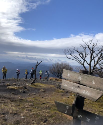 幸いダウンを着こむほどの寒さでもなく、見晴らしの良い稜線上だったので、 先行組は次の目標のホッケ山でしばらく待っててもらい、 ゆっくり組が到着し合流してから出発するようにしました。 快適なスカイラインを其々の組がマイペースで力強く歩き切り、 4座目の蓬莱山山頂の風除けの人工物付近で再集合し、 全員揃って下山することになりました。